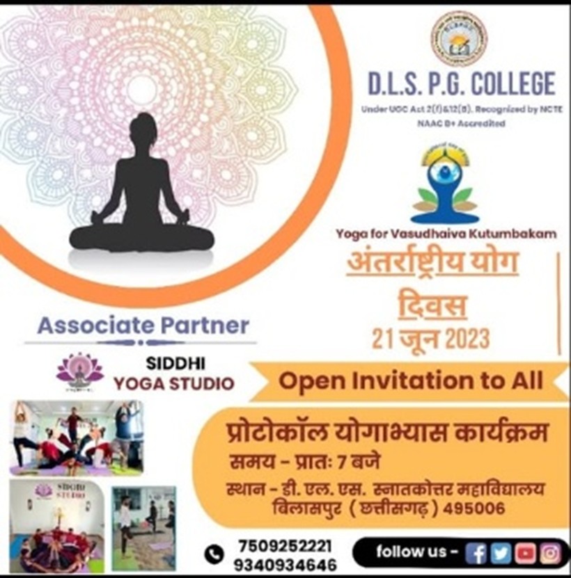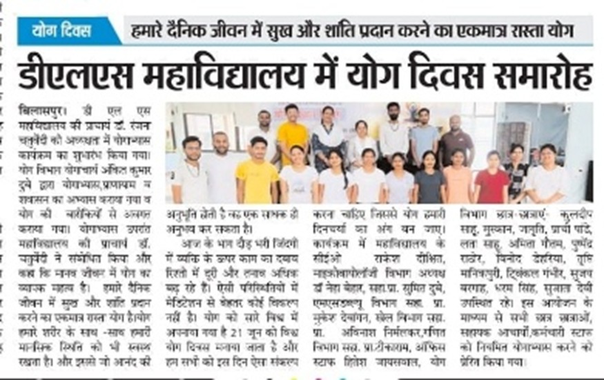 अंतर्राष्ट्रीय योग दिवस 21 जून के अवसर पर प्रत्येक वर्ष की भांति इस वर्ष भी डी. एल. एस. महाविद्यालय में प्रोटोकॉल योगाभ्यास कार्यक्रम आयोजित किया गया। इस वर्ष का थीम भारत सरकार द्वारा एक विश्व एक स्वास्थ्य - योगा फॉर वसुधैव कुटुंबकम रखा है।