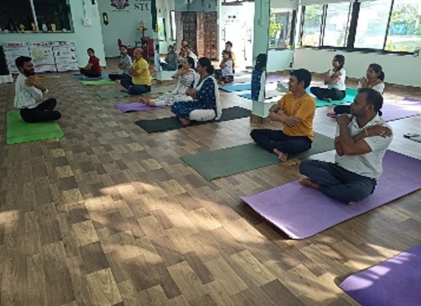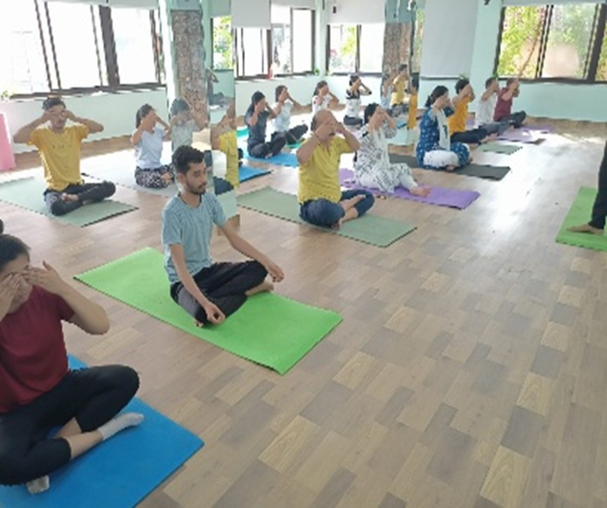 योग विभाग योगाचार्य अंकित कुमार दुबे जी द्वारा योगाभ्यास,प्राणायाम व शवासन का अभ्यास कराया गया व योग की समस्त बारीकियों से अवगत कराया गया। योगाभ्यास उपरांत महाविद्यालय की प्राचार्य डॉ. चतुर्वेदी जी ने संबोधित किया और कहा कि मानव जीवन में योग का व्यापक महत्व है। और इस को अपनाने से शारीरिक स्वास्थ्य भी उत्तम रहता है। हमारे दैनिक जीवन में सुख और शांति प्रदान करने का एकमात्र रास्ता योग है।योग हमारे शरीर के साथ -साथ हमारे मानसिक स्थिति को भी स्वस्थ रखता है। और इससे जो आनंद की अनुभूति होती है वह एक साधक ही अनुभव कर सकता है।आज के भाग दौड़ भरी जिंदगी में व्यक्ति के ऊपर काम का दबाव रिश्तो में दूरी और तनाव अधिक बढ़ रहे हैं। ऐसी परिस्थितियों में मेडिटेशन से बेहतर कोई विकल्प नहीं है। ध्यान से मानसिक तनाव दूर होकर हमारे मन को एक गहरी आत्मिक शांति महसूस होती है। जिससे हमारे शरीर में शक्ति की वृद्धि होती है और रात को अच्छी नींद आती है, और मन की एकाग्रता बढ़ जाती है।योग के नियमित अभ्यास से शरीर को सभी प्रकार की बीमारियों से मुक्त करके हम अपने शरीर को मजबूत और बलिष्ठ बनाते हैं।सुबह के समय खुली हवा में बैठकर नियमित 40 मिनट तक योग करने से शरीर चुस्त-दुरुस्त बनता है, और चेहरे पर निखार आता है। मन को पूर्ण शांति मिलती है, और शरीर में रक्त संचार संतुलित हो जाता है। योग को सारे विश्व में अपनाया गया है 21 जून को विश्व योग दिवस मनाया जाता है और हम सभी को इस दिन ऐसा संकल्प करना चाहिए जिससे योग हमारी दिनचर्या का अंग बन जाए।